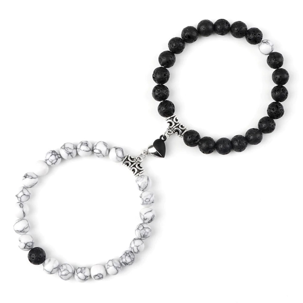 Bracelet de Couple – Cœur Yin- Yang – en Howlite et Pierre de lave – 19cm