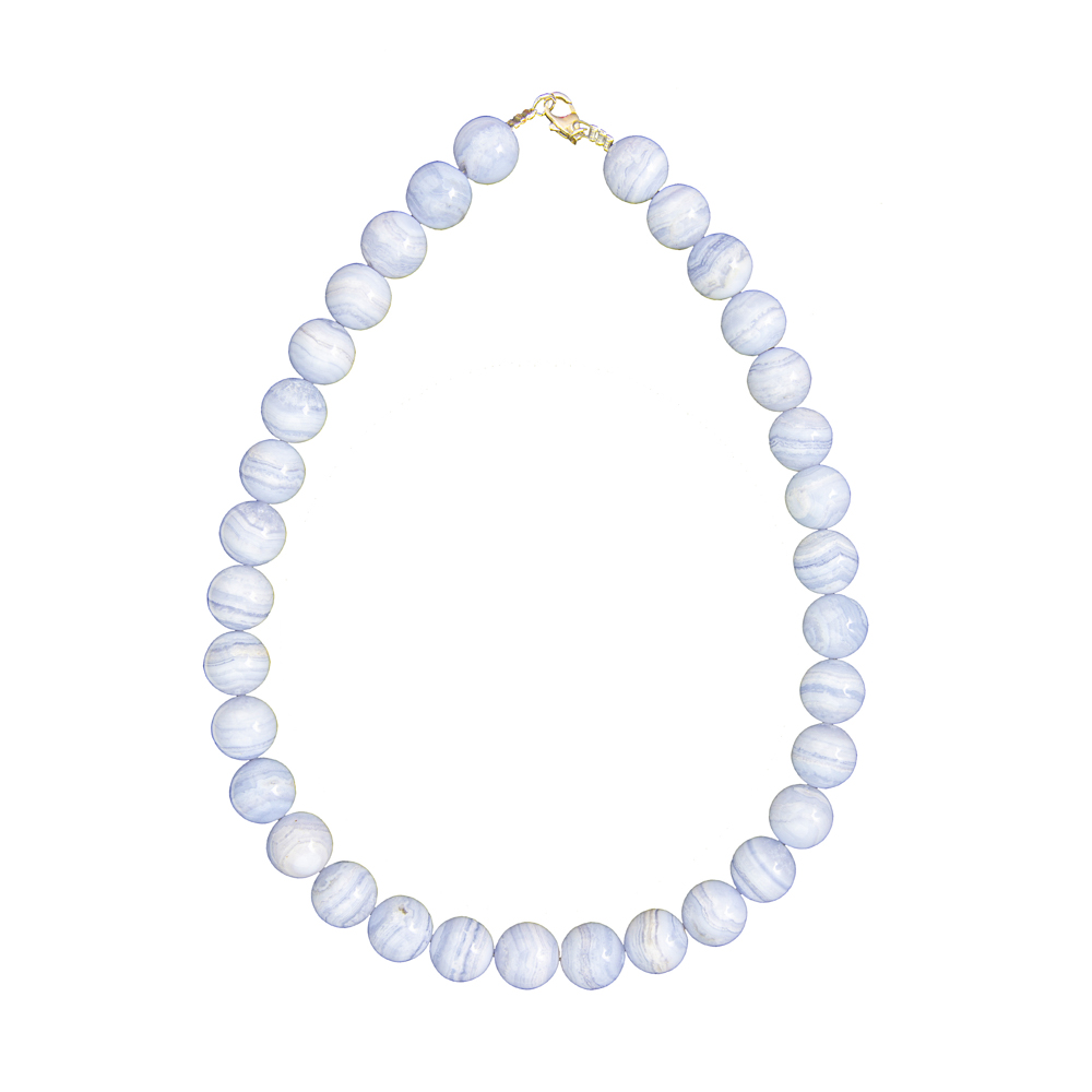 Constitué de perles de 14mm, ce magnifique collier en calcédoine vous fait profiter de la beauté de cette pierre naturelle, mais aussi de ses vertus lithothérapeutiques. Sa teinte bleu clair est élégante et reposante. Découverte plus de 4000 ans avant notre ère, la calcédoine a autant servi pour concevoir des objets utilitaires que des parures. Elle est portée pour ses vertus depuis le Moyen-Âge.