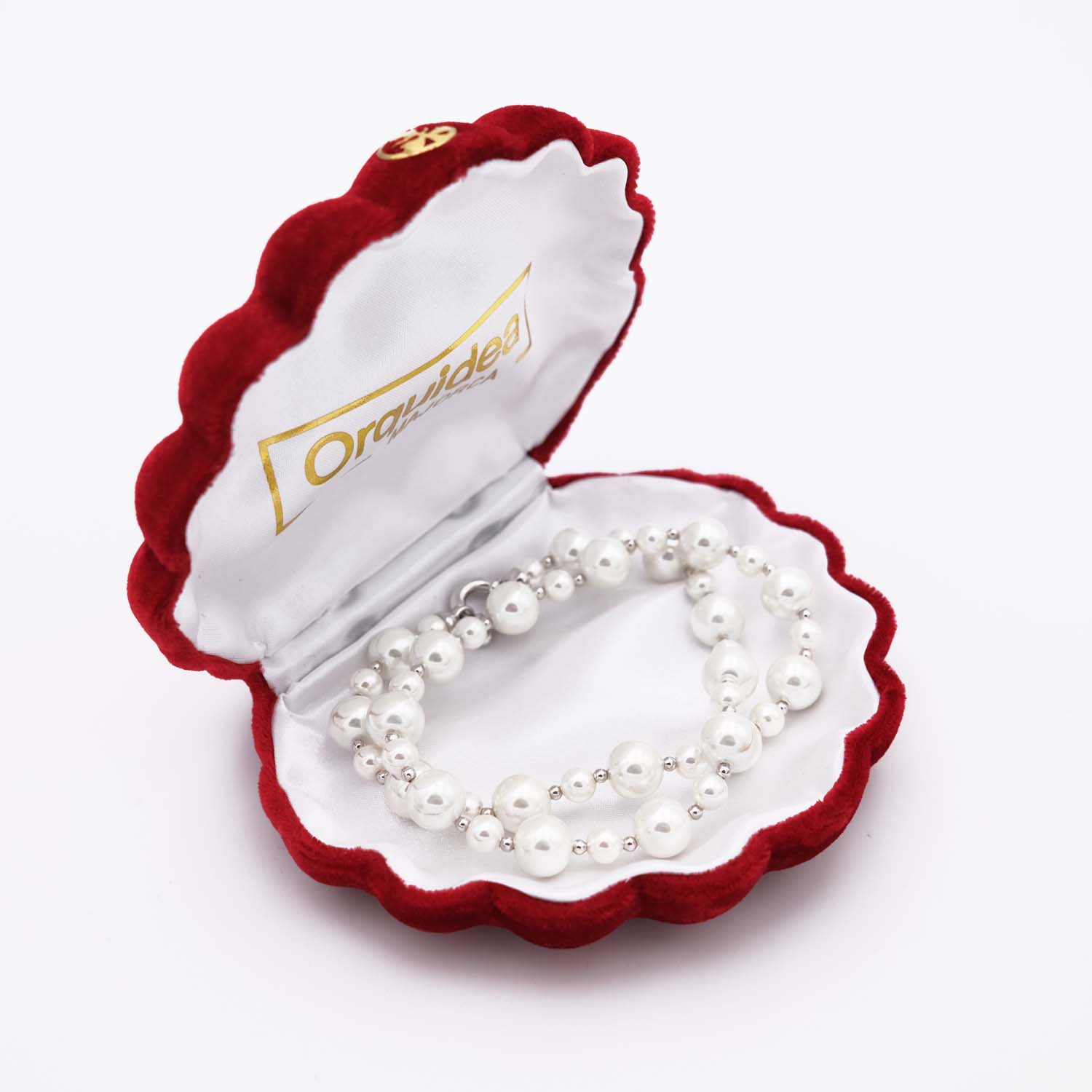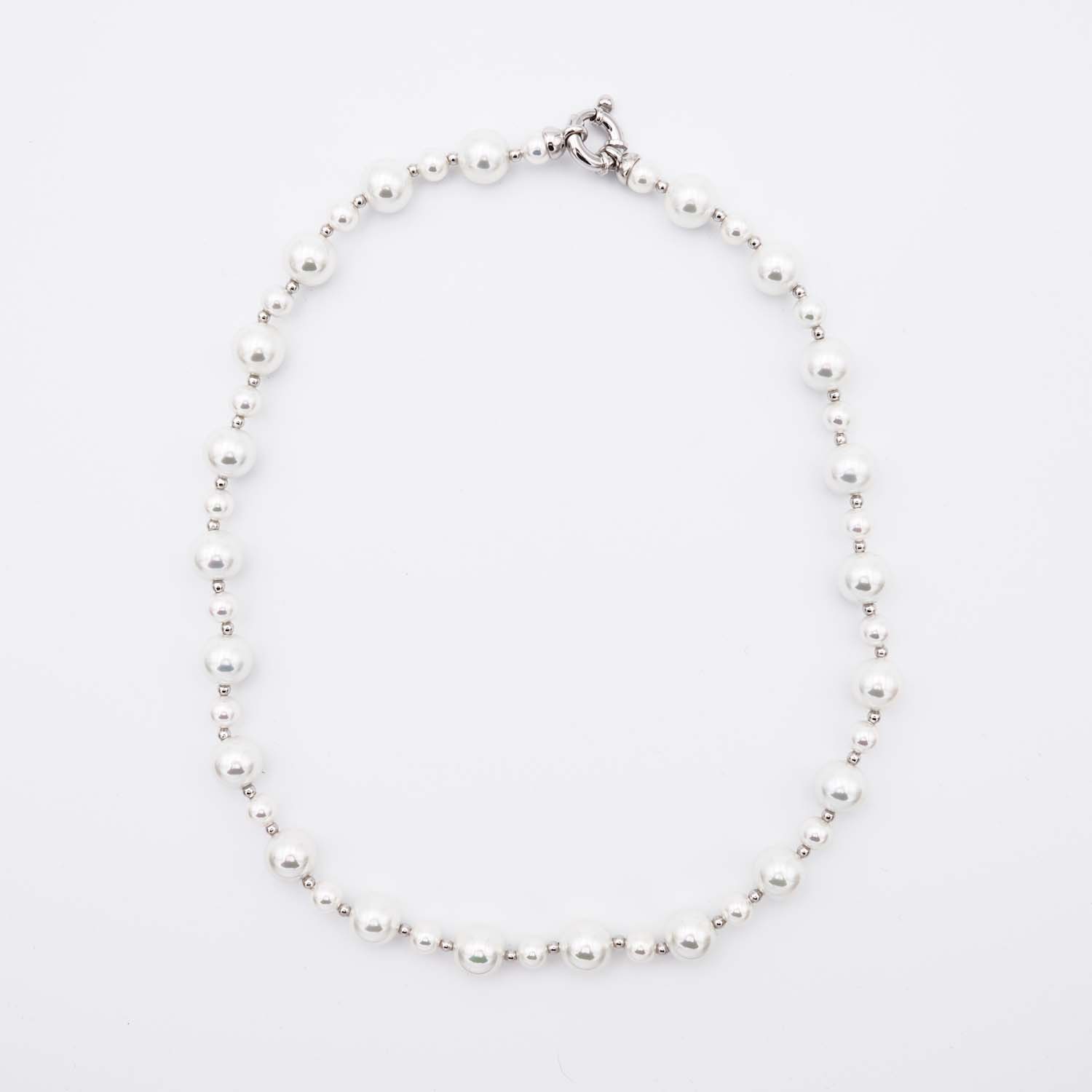 Ce collier est fait de perles de Majorque blanches et d’argent 925. Il offre un contraste doux sur la peau et donne un rendu soigné, discret et élégant. Les perles de Majorque possède une apparence laiteuse et sont considérées comme de très belles pierres en joaillerie, d’où leur popularité.