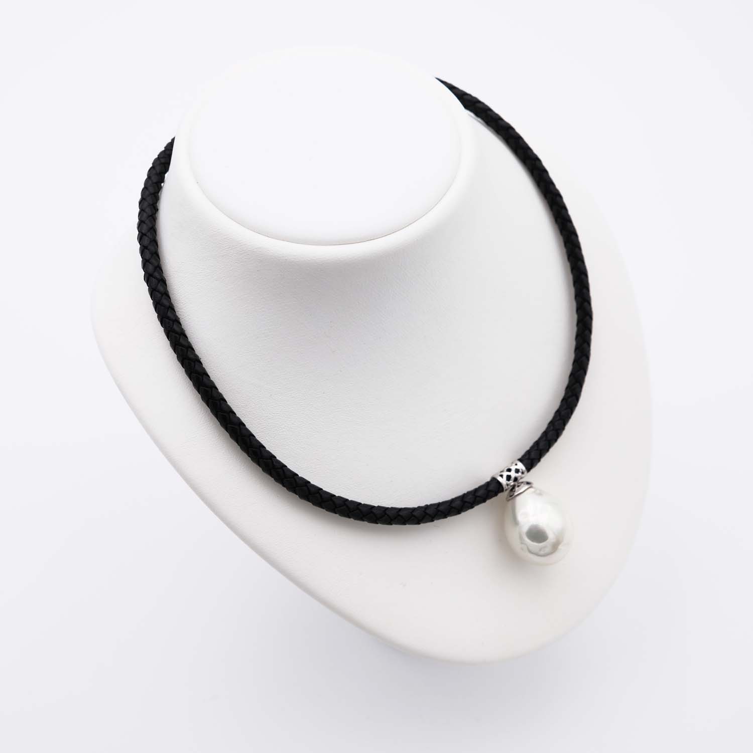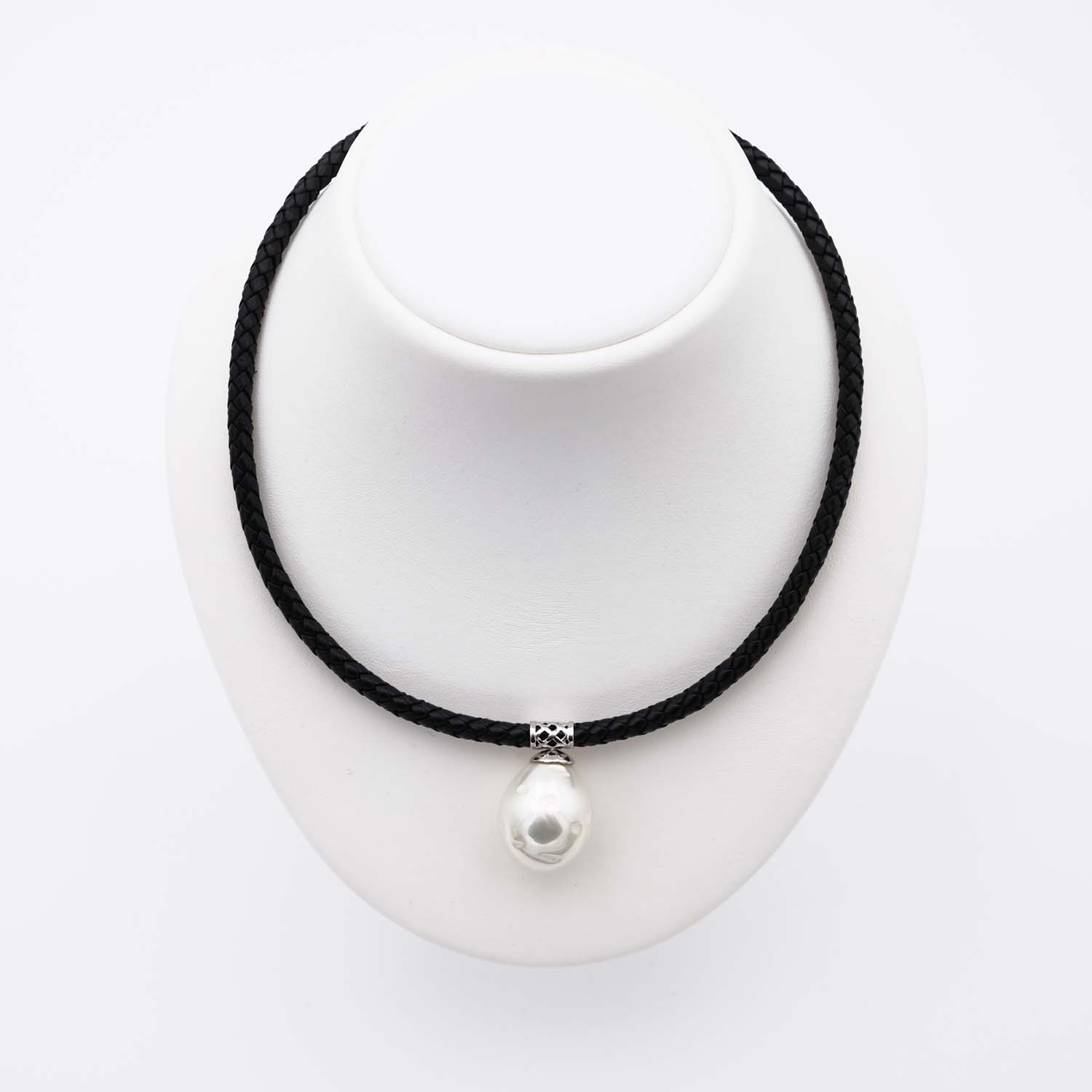 Le collier en perles a une longueur de 41 cm qui peut s’étendre à 45 cm grâce à un chaînon supplémentaire. Ainsi, il se porte soit très serré autour du cou soit, un peu plus large. Le collier en perles est composé d’un cordon en cuir auquel est fixée une énorme perle blanche. L’association du cuir sombre et de la perle d’une pure blancheur met en valeur celle-ci. La forme baroque de cette perle renforce son caractère brut et unique. C’est une perle fabuleuse pour une personne unique et chère à vos yeux.
