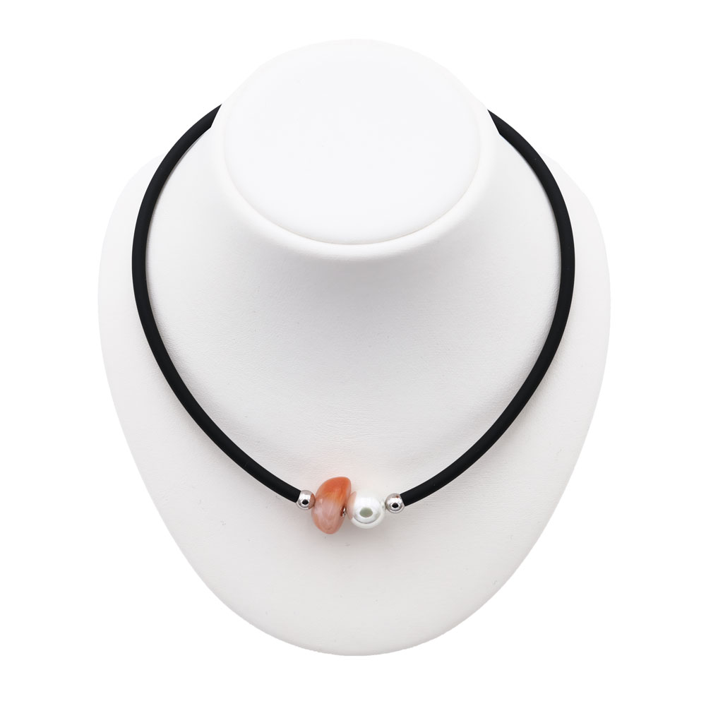 Le collier en perles de Majorque rassemble une perle blanche nacrée et une perle en cornaline. La cornaline avec des nuances orangées et roses apporte de la douceur et de la féminité au collier en perles de Majorque. La cornaline est une pierre qui procure au collier en perles une grande force vitale et une énergie joyeuse.