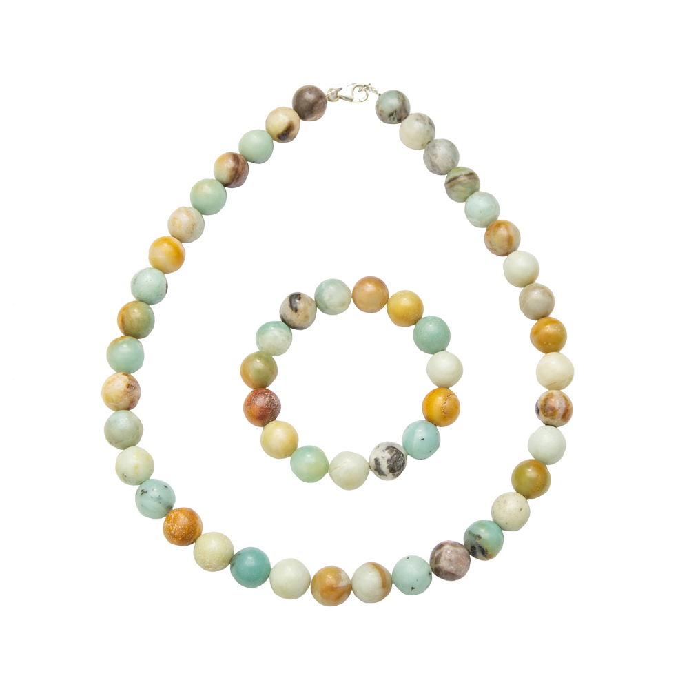 Parure composée du bracelet et du collier en amazonite multicolore en pierres boules de 12mm