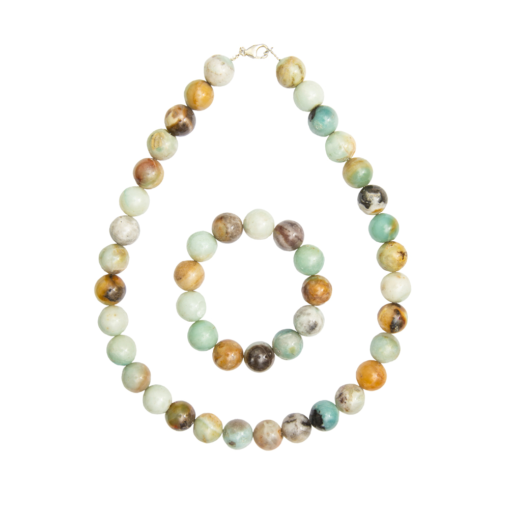 Parure composée du bracelet et du collier en amazonite multicolore en pierres boules de 14mm