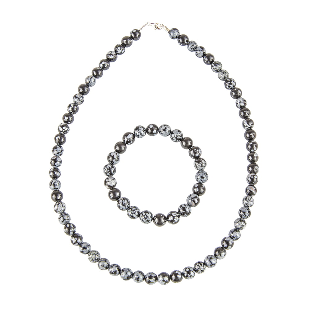 Parure composée du bracelet et du collier en obsidienne flocon de neige en pierres boules de 8mm