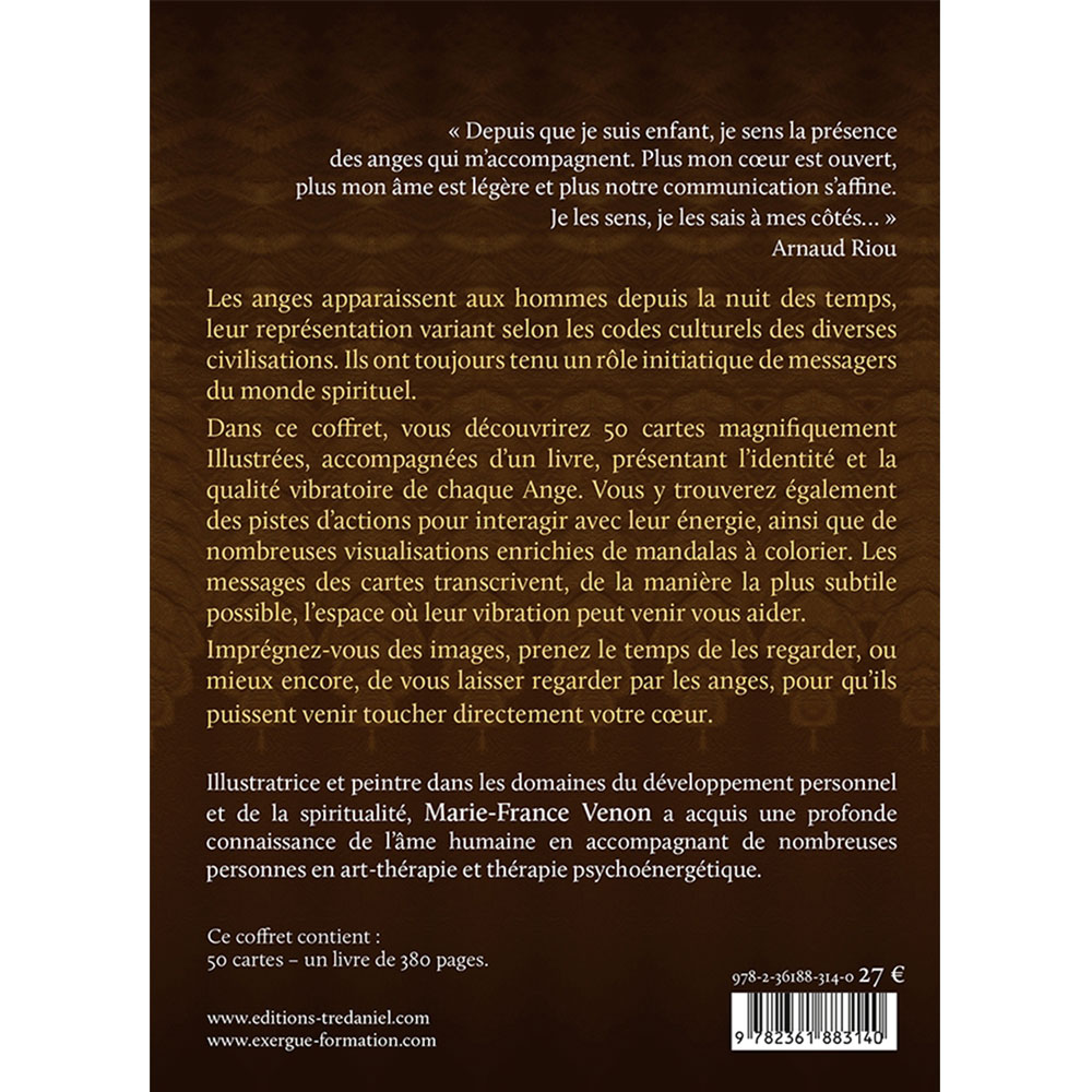 Dans ce coffret, vous découvrirez 50 cartes d’enseignement magnifiquement Illustrées, accompagnées d’un livre, présentant l’identité et la qualité vibratoire de chaque Ange. Vous y trouverez également des pistes d’actions pour interagir avec leur énergie, ainsi que de nombreuses visualisations enrichies de mandalas à colorier. Les messages des cartes d’enseignement transcrivent, de la manière la plus subtile possible, l’espace où leur vibration peut venir vous aider.