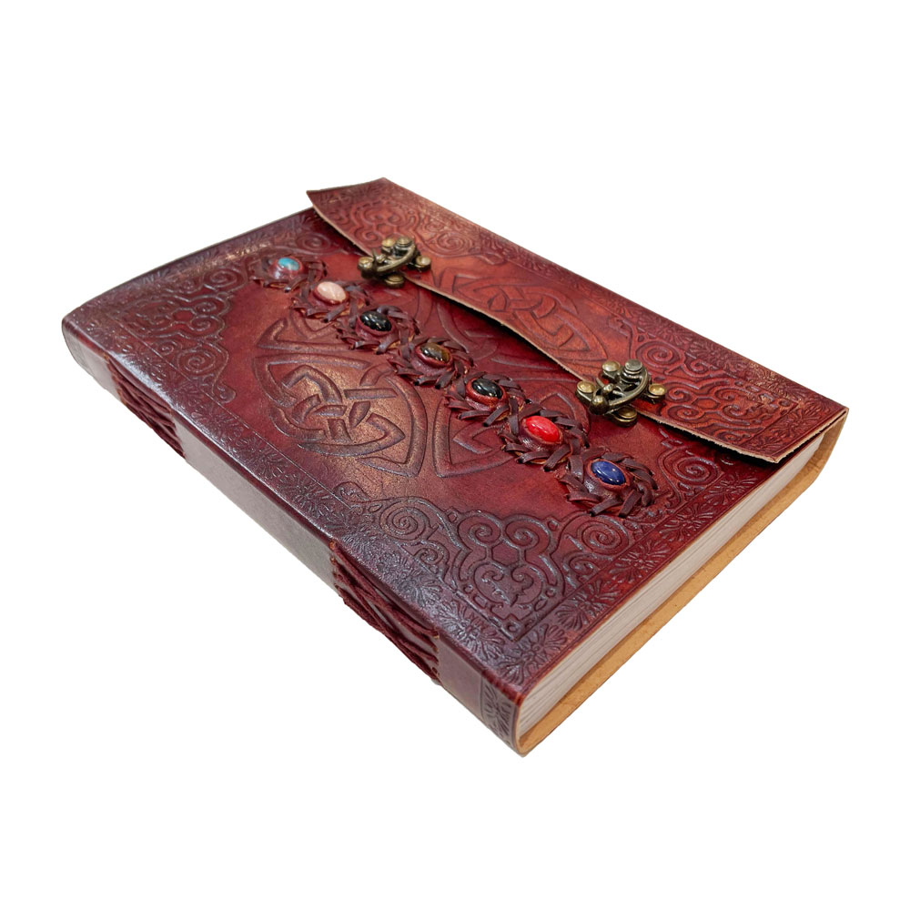 Les 7 chakras sont ciblés grâce à ce journal intime ou carnet en cuir orné de 7 pierres.